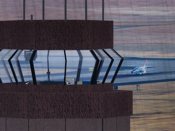 Eine C-101EB der "High Rollers" auf der Piste hinter dem Tower. Nellis AFB, 2020. Rakuzard.